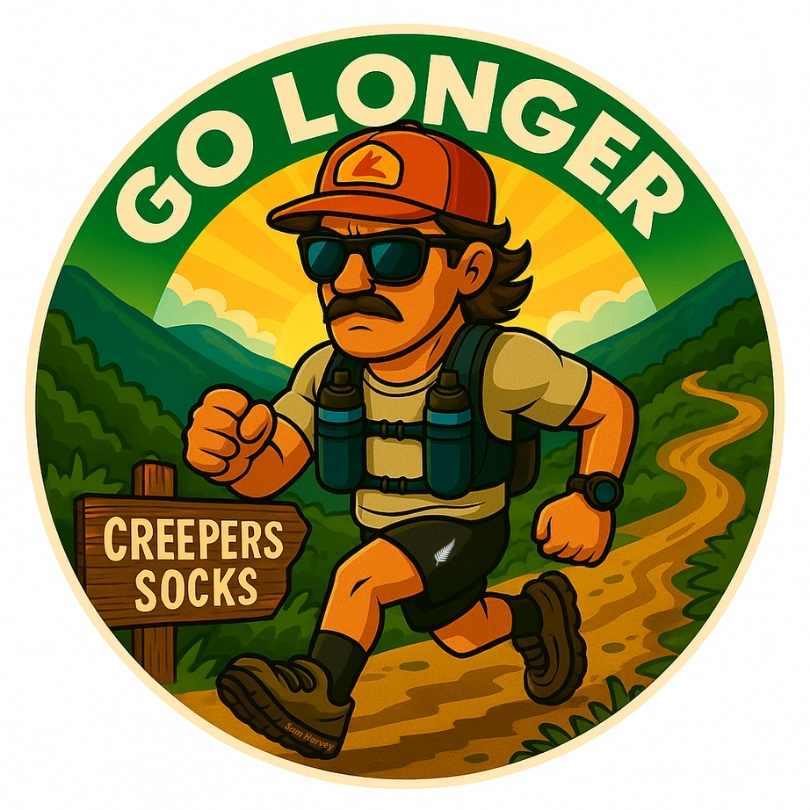 A limited-edition “Go Longer” sticker, co-designed with Sam Harvey to commemorate his monumental Backyard Ultra feats, along with his limited edition sock release.